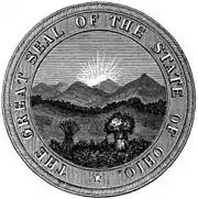 The design was traditionally said to depict the view from U.S. Senator Thomas Worthington's Chillicothe-area estate, Belle View: in 1803, Creighton emerged from an all-night meeting at the estate and saw "the rising sun of the new state" just beyond Mount Logan.[8] Creighton and Worthington both belonged to the "Chillicothe Junto" that dominated early state politics.[10] However, most historians regard the story to be apocryphal, noting that the sun, mountains, and agricultural implements were common in seals of that era.[11] Regardless, the present seal does represent the view from Worthington's estate, now known as Adena, as a matter of law.