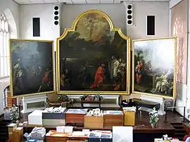 The painting is now displayed in St Nicholas, Bristol.[12] The church was damaged by incendiary bombs during World War II and was considered for demolition in the 1950s. The building was partially restored and the roof replaced by 1964 when it was leased to The Corporation of Bristol as a museum of church artefacts and local history. It opened in 1973 and Hogarth's triptych was installed at the eastern end. The museum closed in 1991; however the painting remained within the offices of the Bristol & Region Archaeological Services.[13][14] When the church was re-consecrated in 2018, the three paintings were put on display to the public again.[15]
