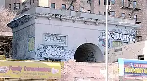 The Seaman-Drake Arch, also known as the Inwood Arch, is a remnant of a hilltop estate built in 1855 in the Inwood neighborhood of Manhattan, New York City by the Seaman family. Located at 5065 Broadway at West 216th Street, the arch was built from Inwood marble quarried nearby. It is 35 feet (10.67 m) tall, 20 feet (6.10 m) deep, and 40 feet (12.19 m) wide, and was once the gateway to the estate.[1]