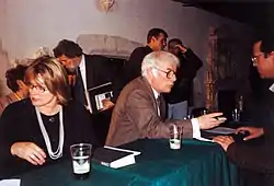Heaney was awarded the Nobel Prize in Literature in 1995 for "works of lyrical beauty and ethical depth, which exalt everyday miracles and the living past".[43] He was on holiday in Greece with his wife when the news broke. Neither journalists nor his own children could reach him until he arrived at Dublin Airport two days later, although an Irish television camera traced him to Kalamata. Asked how he felt to have his name added to the Irish Nobel pantheon of W. B. Yeats, George Bernard Shaw and Samuel Beckett, Heaney responded: "It's like being a little foothill at the bottom of a mountain range. You hope you just live up to it. It's extraordinary."[44] He and his wife Marie were immediately taken from the airport to Áras an Uachtaráin for champagne with President Mary Robinson.[44] He would refer to the prize discreetly as "the N thing" in personal exchanges with others.[45]