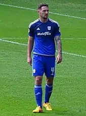 Morrison was handed the captain's armband at the start of the following season, in the absence of club captain, David Marshall.[57] Morrison was ever-present in Cardiff's starting eleven before suffering a knee injury during a 1–0 loss to Birmingham City on 19 December 2015, which was initially expected to rule him out for a month.[58] However, his return was delayed until 5 March 2016, when he came on in place of Lee Peltier in a 2–0 win against Severnside rivals Bristol City.[59] Morrison saw Cardiff miss out on a play-off place after losing to Sheffield Wednesday, before receiving an operation, meaning he would miss the final game of the season and potentially the start of the next season.[60][61] Morrison returned in time for the new season and was named as captain in Cardiff's 1–0 loss to Bristol Rovers in the EFL Cup.[62] In September, he was named as permanent club captain by manager Paul Trollope, following the sale of David Marshall.[63] Morrison made a career-high 46 appearances, scoring four goals during the season.[64]