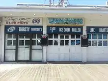 On September 12, 2013, a ten-alarm fire swept from the Funtown Pier northward.[34] The fire is believed to have started under the boardwalk, below the Kohr's Custard stand at the southern end of the pier. The wind pushed it northward, and fire crews were able to make a stand at Lincoln Avenue by tearing up the newly replaced boardwalk which had been destroyed less than a year before by Hurricane Sandy.[35] Jack & Bill's Bar and Kohr's Custard were two businesses that were both destroyed in the 1955 and 2013 fires.