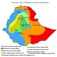 Kiremt is the rainy season where 85% to 95% of food crops are produced.[8][9] Covering from June to August, the season is marked by frequent rains and homogeneous temperatures mainly from June and August. The magnitude of the rainfall in this season is higher than other seasons in most parts of the country.[10]