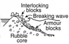 | Mound | Mound type seawalls, using revetments or riprap, are used in less demanding settings where lower energy erosional processes operate. The least exposed sites involve the lowest-cost bulkheads and revetments of sand bags or geotextiles. These serve to armour the shore and minimise erosion and may be either watertight or porous, which allows water to filter through after the wave energy has been dissipated.[16] | |||
