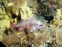 Sebastes rockfish are found in the temperate North and South Pacific and Atlantic Oceans.[12] Rockfish range from the intertidal zone to almost 3,000 m (9,800 ft) deep, usually living benthically on various substrates, often, as the name suggests, around rock outcrops.[13]