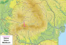 The Sebeș (Hungarian: Sebes, German: Mühlbach) is a left tributary of the river Mureș in Transylvania, Romania.[1][2] The upper reach of the river (upstream of Lake Oașa) is also known as Frumoasa.[3] The Romanian and Hungarian name Sebeș and Sebes originate from the Hungarian adjective sebes meaning "speedy", while the German name means Mill Creek. The source of the river is on the south slope of the Cindrel Mountains, in the southwestern part of Sibiu County. It flows through the reservoirs Oașa and Tău.[1] It discharges into the Mureș in Oarda, near Alba Iulia.[3] Its length is 96 km (60 mi) and its basin size is 1,304 km2 (503 sq mi).[2]