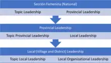 The Women's Section closely mirrored the strict hierarchical structure of Falange, which allowed it to be easily subverted into Franco's regime by controlling the people at the top of its institutional ladder.[15] The structure followed the male structure, and was established during the Civil War. The national organization appointed provincial leaders, who would in return report back on the needs of their area. These leaders in turn would report provisional leaders to deal with specific areas and to appoint local leaders on a village or district level. They would in turn appoint leaders to deal with specific areas on the village or district level.[15]
