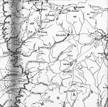 The 2nd Light Horse Brigade was delayed by the difficult track up the Wadis Jeri'a and Sir which did not reach Ain Hummar on the main road five miles (8.0 km) east of Es Salt until the afternoon of 24 September. The main road had been blown up in places by the retreating Ottoman Army, forcing Chaytor to pause on 24 September to wait for supplies as well. During the day the New Zealand Mounted Rifles Brigade occupied Suweile and one hundred men from the Auckland Mounted Rifles Regiment took 11 hours to ride twenty miles (32 km), cut the railway five miles (8.0 km) north of Amman and return to Suweile.[43] Accompanied by four officers, the raiding group carrying nothing but tools and weapons, advanced twelve miles (19 km) to the railway, where they took out a section of the Hedjaz line five miles (8.0 km) north of Amman near Kalaat ez Zerka station.[44][45][46][Note 7]