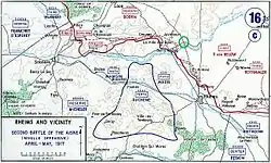 The Second Battle of the Aisne involved c. 1.2 million troops and 7,000 guns on a front from Reims to Roye, with the main effort against the German positions along the Aisne river.[4] The plan of December 1916 was plagued by delays and information leaks. By the time the offensive began in April 1917, the Germans had received intelligence of the Allied plan and strengthened their defences on the Aisne front. The German retreat to the Hindenburg Line Operation Alberich (Unternehmen Alberich) left a belt of devastated ground up to 40 km (25 mi) deep in front of the French positions facing east from Soissons, northwards to St. Quentin. Alberich freed 13 to 14 German divisions, which were moved to the Aisne, increasing the German garrison to 38 divisions against 53 French divisions.[5] The German withdrawal forestalled the attacks of the British and Groupe d'armées du Nord (GAN) but also freed French divisions for the attack. By late March, GAN had been reduced by eleven infantry, two cavalry divisions and 50 heavy guns, which went into the French strategic reserve.[6]