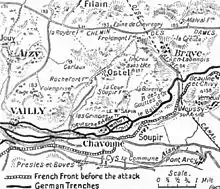 At 8:30 p.m. on 23 May, a German assault on the Vauclerc Plateau was defeated and on 24 May, a renewed attack was driven back in confusion.[33] During the night the French took the wood south-east of Chevreux and almost annihilated two German battalions. On 25 May, three German columns attacked a salient north-west of Bray-en-Laonnois and gained a footing in the French first trench, before being forced out by a counter-attack. On 26 May German attacks on salients east and west of Cerny were repulsed and from 26 to 27 May, German attacks between Vauxaillon and Laffaux Mill broke down. Two attacks on 28 May at Hurtebise were defeated by French artillery-fire and on the night of 31 May – 1 June and attacks by the Germans west of Cerny also failed. On the morning of 1 June, after a heavy bombardment, German troops captured several trenches north of Laffaux Mill and lost them to counter-attacks in the afternoon. On 2 June a bigger German attack began, after an intensive bombardment of the French front, from the north of Laffaux to the east of Berry-au-Bac. On the night of 2/3 June, two German divisions made five attacks on the east, west and central parts of the Californie Plateau and the west end of the Vauclerc Plateau. The Germans attacked in waves, at certain points advancing shoulder-to-shoulder, supported by flame-thrower detachments and gained some ground on the Vauclerc Plateau, until French counter-attacks recovered the ground. Despite the French holding improvised defences and the huge volumes of German artillery-fire used to prepare attacks, the German organised counter-attacks (Gegenangriffe) met with little success and at Chevreux north-east of Craonne, the French had even pushed further into the Laon Plain.[34]