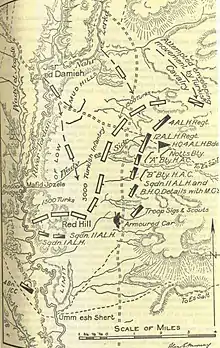 Posts held by the Ottoman cavalry formed a defensive line extending across the valley from Umm esh Shert.[91] This defensive line formed a line of communications, linking the German and Ottoman forces in the Fourth Army west of the Jordan River with the VIII Corps defending Shunet Nimrin. These defensive posts were attacked by the 4th Light Horse Brigade mounted, and driven back towards Mafid Jozele 4.5 miles (7.2 km) north of Umm esh Shert.[51][91] While the 3rd and 4th Light Horse Brigades continued northwards the 1st Light Horse Regiment (1st Light Horse Brigade) was ordered to attack the German and Ottoman force on Red Hill about 6,000 yards (5,500 m) north-east of Umm esh Shert.[92]