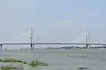 The Second Wuhan Yangtze River Bridge (Chinese: 武汉长江二桥, Wuhan Changjiang Er Qiao) is a bridge across the Yangtze River in Wuhan, Hubei province, China. It is located northeast (downstream) of the historic central area of the city's Hankou District and is the northern crossing for the Inner Ring Road. It is a cable-stayed bridge built of pre-stressed concrete, has a central span of 400 metres (1,300 ft).[1] It is 4.678 kilometres (2.907 mi) in length (including the 1,876-metre (6,155 ft) main span) and is 26 metres (85 ft) wide. Its main bridgeheads are 90 metres (300 ft) high each, pulling 392 thick slanting cables together in the shape of double fans, so that the central span of the bridge is well-balanced on the piers and the bridge's stability and vibration resistance are ensured.