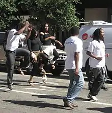 The second line is a tradition in parades organized by Social Aid and Pleasure Clubs (SAPCs) with brass band parades in New Orleans, Louisiana, United States. The "main line" or "first line" is the main section of the parade, or the members of the SAPC with the parading permit as well as the brass band. The second line consists of people who follow the band to enjoy the music, dance, and engage in community. The second line's style of traditional dance, in which participants dance and walk along with the SAPCs in a free-form style with parasols and handkerchiefs, is called "second-lining". It is one of the most foundationally Black American–retentive cultures in the United States.[1] It has been called "the quintessential New Orleans art form – a jazz funeral without a body".[2] Another significant difference from jazz funerals is that second line parades lack the slow hymns and dirges played at funerals (although some organizations may have the band play a solemn selection toward the start of the parade in memory of members who died since their last parade).
