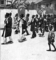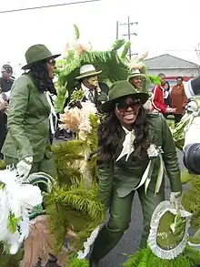 African and African-American traditions continued throughout the "Code Noir" and Jim Crow eras in New Orleans.[1] African-Americans formed Benevolent Societies and "Social, Aid & Pleasure Clubs" because white Insurance companies often refused to cover free people of color and/or the formerly enslaved. SAPCs assisted members through illness and supported families with burial costs for deceased members. This is a carry-over from African traditions that believed in celebrating the member's spirit leaving the body to return to the ancestors and God. This led to what became known as a "jazz funeral", with the SAPC members marching in a dirge with a brass band before the deceased body being "cut loose" and a celebratory parade begins. The same club exercised their social aspect with a colorful, annual, public second line parade through their home community.[1]