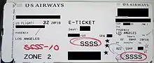 Passengers who have been selected for secondary screening will have the letters SSSS or *S* (all capitals) printed on their boarding passes as a signal for the need for a thorough search at security checkpoints.[4] In the case of Southwest Airlines, secondary screening selectees may have a "checkerboard" pattern printed on their boarding passes.[5]