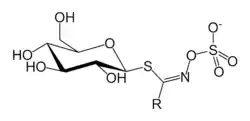 Structural formula for glucosinolates. The side group ‘’R’’ can vary. The structure includes a glucose molecules (to the left), a nitrogen atom derived from an amino acid, and two sulfur atoms, among which one derives from glutathione and the other from sulfate (seen to the left).[13]