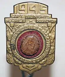 The most well-known example started in 1934 with the Ovaltine company's sponsored radio program Little Orphan Annie.[2] The show's fan club, "Radio Orphan Annie's Secret Society", distributed a member's handbook that included a simple substitution cipher with a resulting numeric cipher text. This was followed the next year with a membership pin that included a cipher disk—enciphering the letters A–Z to numbers 1–26. From 1935 to 1940, metal decoders were produced for the promotion. From 1941 on, paper decoders were produced. Similar metal badges and pocket decoders continued with the Captain Midnight radio and television programs.