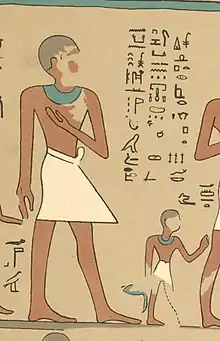 Sedjemnetjeru was an ancient Egyptian artist who worked and lived in the Second Intermediate Period (about 1650 BC) in Elkab and Nekhen. He is one of the very few Ancient Egyptian artists who is known from several inscriptions and whose work is also known. Sedjemnetjeru is depicted in the tomb of Horemkhauef where he bears the titles draughtsman and great one of the tens of Upper Egypt. The first title shows that he was an artist and it seems most likely that he painted the decoration in the tomb of Horemkhauef. Sedjemnetjeru is also mentioned in the tomb of the local governor Sobeknakht II and it seems likely that he painted this tomb too. Here he is shown in the procession behind the tomb owner's catafalque. Here he bears again the titles great one of the tens of Upper Egypt and draughtsman.[1] Finally, Sedjemnetjeru is also mentioned in the tomb of a certain Hormin, that he most likely decorated too.[2]