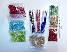 Seed beads or rocailles[1][2] are uniformly shaped, spheroidal beads ranging in size from under a millimeter to several millimeters. Seed bead is also a generic term for any small bead. Usually rounded in shape, seed beads are most commonly used for loom and off-loom bead weaving. They may be used for simple stringing, or as spacers between other beads in jewelry.