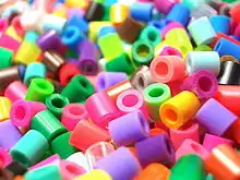 Larger seed beads are used in various fiber crafts for embellishment, or crochet with fiber or soft, flexible wire. The largest size of a seed bead is 1/0 ("one-aught", sometimes written 1/°) and the smallest is 24/0, about the size of a grain of sand.[3] However, seed beads that are size 5/0 or 6/0 are usually called "pony beads" rather than "seed beads"; the next larger class of seed beads, from 3/0 to 4/0, are usually called "trade beads"; the largest class of seed beads, including 1/0, 2/0, and anything larger, are usually referred to as "crow beads." The range of seed beads in most modern seed bead work covers the sizes 6/0, 8/0, 11/0, 12/0, 13/0 and 15/0. Sizes 6/0, 8/0 and 11/0 are often used in beaded knitting, as well as bead knitting. The extremely small class of seed beads smaller than 15/0 have not been in production since the 1890s and any in existence are usually considered antiques.[4]