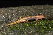 The seepage salamander is a very small and slender salamander, ranging from 4.4–5.7 cm (1.75–2.25 in). The adults possess vomerine teeth.[2] The tail is terete and rounded. The seepage salamander has a pale dorsal stripe, with a wide, wavy to almost straight shape, and ranging in color from yellow or tan to reddish brown.[4] The stripe is sometimes flecked with a darker pigment. A mid-dorsal, dark line is also seen and is continuous with a Y-shaped mark on the head. There is a dark brown band on the sides, fading towards the belly. The underbelly is pale and is mottled with brown and white, but it may also be plain, with no other coloration.[4]