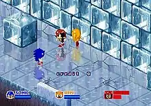 The game takes place over seven levels, which must be completed in the fastest time possible. Players use a trackball to control a characters' speed and direction from an isometric perspective, and a button to make a character jump into a Spin Attack.[6] Each character has a health bar, which is depleted when the player falls into traps; players lose a life if the bar empties. Health can be recovered by collecting rings that are littered around the course or hidden inside obstacles or enemies. Players receive bonus rings for use in later levels they collect over a certain percentage of rings within a level.[3][4] Upon reaching Eggman at the end of the game, he pushes a button that causes the island to self-destruct. The three heroes manage to escape unharmed, while Eggman is left stranded at sea.[5][7]