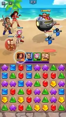 Sega Heroes was a match 3 game, where the player had to match three or more tiles or shapes of the same color to score points and defeat enemies on the field. There were five different colored tiles, and four of them that could control a character's actions and abilities. The player had to select four characters of different colors (blue, green, red, and yellow) in order to battle enemies in an event. Depending on the color of the character, the tiles that were matched determined if a character attacked an opponent. If the player matched three or more tiles of the same color together, it resulted in the hero of that color gaining energy and attacking an enemy of choice. The tiles came in four separate colors (for each color-type); red, green, yellow, and blue, as well as purple for boost. Matching purple tiles together increased the multiplier, resulting in the selected heroes becoming stronger. Matching four tiles together created a star tile, while matching six tiles together created another type of Star tile that exploded a piece of the board and activated a different ability. The MAX ability triggered a character's special move.