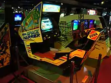 Space Harrier[lower-alpha 1] is a third-person arcade rail shooter game developed by Sega and released in 1985. It was originally conceived as a realistic military-themed game played in the third-person perspective and featuring a player-controlled fighter jet, but technical and memory restrictions resulted in Sega developer Yu Suzuki redesigning it around a jet-propelled human character in a fantasy setting. The arcade game is controlled by an analog flight stick while the deluxe arcade cabinet is a cockpit-style hydraulic motion simulator cabinet that tilts and rolls during play, for which it is referred as a taikan (体感) or "body sensation" arcade game in Japan.