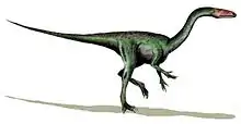 Segisaurus lived about 183 million years ago during the Jurassic period. It was a primitive bipedal theropod roughly around the size of a goose. Segisaurus was 1 meter (3.3 feet) long, half a meter (1.65 feet) tall and weighed about 4-7 kilograms. It was nimble and insectivorous, although it may have scavenged meat also. It was bird-like in structure, with a flexible, elongated neck and stout body. Segisaurus was three-toed and had powerful legs that were long compared to its body length. Like its legs, Segisaurus had a long tail and long forearms. Its furcula bone was not unlike a bird's, thus strengthening scientists' arguments that dinosaurs were related to avians. Segisaurus is described from the only specimen ever found, the holotype UCMP 32101, which was a sub-adult. The full size of Segisaurus as an adult may never be known. Furcula were found in the Segisaurus specimen, making it one of the first known non-avian dinosaurs to preserve furcula found.[1] These furculae were initially thought to be clavicles, which led Charles Lewis Camp to speculate that the "splint-like" neck ribs supported a Draco-like patagium along the neck, to improve the animal's ability to move quickly.[2] Segisaurus is significant because it demonstrates that the clavicle was primitively present in early theropods.[3]