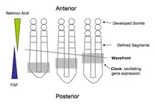 In vertebrates, segmentation is most often explained in terms of the clock and wavefront model. The "clock" refers to the periodic oscillation in abundance of specific gene products, such as members of the Hairy and Enhancer of Split (Hes) gene family. Expression starts at the posterior end of the embryo and moves towards the anterior, creating travelling waves of gene expression. The "wavefront" is where clock oscillations arrest, initiating gene expression that leads to the patterning of somite boundaries. The position of the wavefront is defined by a decreasing posterior-to-anterior gradient of FGF signalling. In higher vertebrates including Mouse and Chick, (but not Zebrafish), the wavefront also depends upon an opossing anterior-to-posterior decreasing gradient of retinoic acid which limits the anterior spreading of FGF8; retinoic acid repression of Fgf8 gene expression defines the wavefront as the point at which the concentrations of both retinoic acid and diffusible FGF8 protein are at their lowest. Cells at this point will mature and form a pair of somites.[7][8] The interaction of other signaling molecules, such as myogenic regulatory factors, with this gradient promotes the development of other structures, such as muscles, across the basic segments.[9] Lower vertebrates such as zebrafish do not require retinoic acid repression of caudal Fgf8 for somitogenesis due to differences in gastrulation and neuromesodermal progenitor function compared to higher vertebrates.[10]