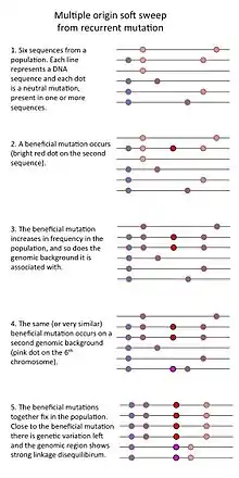 - Finally, a "multiple origin soft sweep" occurs when mutations are common (for example in a large population) so that the same or similar beneficial mutations occurs on different genomic backgrounds such that no single genomic background can hitchhike to high frequency.[3]