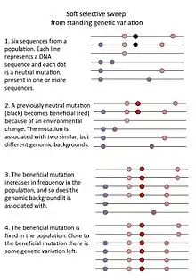 - Another type of sweep, a "soft sweep from standing genetic variation," occurs when a previously neutral mutation that was present in a population becomes beneficial because of an environmental change. Such a mutation may be present on several genomic backgrounds so that when it rapidly increases in frequency, it doesn't erase all genetic variation in the population.[2]