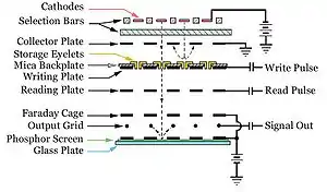 Reading was accomplished by scanning the reading gun across the storage area. This gun was set to a voltage that would cross the secondary emission threshold for the entire display. If the scanned area held the holding gun potential a certain number of electrons would be released, if it held the writing gun potential the number would be higher. The electrons were read on a grid of fine wires placed behind the display, making the system entirely self-contained. In contrast, the Williams tube's read plate was in front of the tube, and required continual mechanical adjustment to work properly.[6] The grid also had the advantage of breaking the display into individual spots without requiring the tight focus of the Williams system.