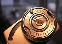The picture on the right shows the device of the Zenit - E model, mounted on a left side of the camera. The inner (flat) circle rotates with the help of the knob and sets the film sensitivity (visible in both DIN and ASA units through tiny windows). The outer circle is coupled to the moving O - shaped marker in the scale on the left and must be rotated till the marker covers the needle (visible in the left corner). The recommended exposures can be read on a side scale against the possible apertures (top scale). The device is not directly coupled to actual aperture and exposure controls[1]