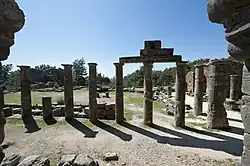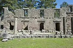 There are remains of an agora containing a row of two-storey and three-storey building façades, a gate, a mausoleum, a Roman bath, a necropolis, in addition to several temples and churches.