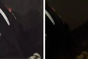Striking is the skill wherewith the painter rendered fabrics. The black cloth of the jacket contrasts with the silk collar, just as the hard nose of his fleshy face stands out against his fine, sleek hair.[4][3] What is striking about the portrait is the self-satisfied, penetrating and slightly mocking look. The confrontation between the painter and the audience is very direct.[2] The painter clearly shows his self-pride in this portrait.