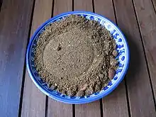 Sellou[1] (Moroccan Arabic: سلّو səllu), also called slilou or sfouf, is a dessert consumed in Morocco. It is made from a base of roasted flour mixed with butter, honey, almonds, sesame, and possibly other nuts and spices,[3] it is one of the important dishes in Morocco during the holy month of Ramadan.[4] Of Berber origin, its ancestor the aselou consumed by the Almoravid sultans was prepared with wheat and honey.
