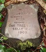 The oak that stood there was finally felled in May 1909 amid fears about its safety, due to damage to its roots caused by the building of the nearby houses. The tree was cut-up and the stump removed to Selly Oak Park, where it remains to this day, bearing a brass plaque that reads "Butt of Old Oak Tree from which the name of Selly Oak was derived. Removed from Oak Tree Lane, Selly Oak 1909".[58] By 2011 the stump had become quite rotten and the brass plaque was no longer secure. It was removed by the Friends of Selly Oak Park and replaced with a replica plaque. The original was retained by the Friends for conservation. The remains of the stump were left in the park.