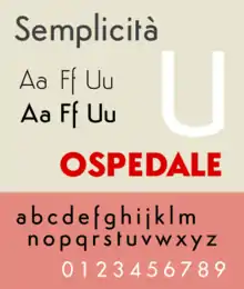 Semplicità, named for the Italian for "simplicity", is an example of the new wave of "geometric" sans-serifs such as Erbar and Futura appearing in the late 1920s and early 1930s.[5][6][7] These designs were based on the proportions of the circle and the square and the influence of Roman square capitals, breaking from traditional "grotesque" designs of the nineteenth century.[6][5] Semplicità, however, has a number of unusual features, including a 'U' with an angle, following the classical model, and an 'f' which descends below the baseline.[8][lower-alpha 2] It is also a "spurless" design, similar to the contemporary Bernhard Gothic and more recently FF Dax, in which most strokes end without terminals.[8][3] These features give Semplicità an appearance similar to some of the flamboyant, modernist Art Deco lettering of the period.[4][8]