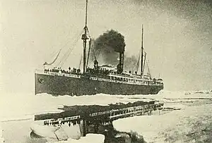 The eagerness of the rushers to reach the gold fields had the ships sailing north at the earliest conceivable moment. In the event, this proved too early as the sea ice had not retreated from Nome. On June 5, the ship was stopped by the ice 140 miles short of her destination. Her captain anchored Senator to the ice, along with about 20 other craft, waiting for the ice to break up. The Revenue Cutter USS Bear, an early icebreaker, passed close by en route to Nome. The captain of the Senator called out to Michael A. Healy, famed captain of the Bear, to ask if he could follow. Healy replied, "You can if you want to...", but the Senator's captain chose to remain behind.[35] Senator's hull was dented, starting a leak, but she finally freed herself and back-tracked to Dutch Harbor, Alaska, making port on June 7, 1900.[36] Her second attempt was successful, and Senator was able to reach Nome on June 12, 1900.[37]