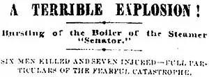 At 2:45 p.m. on May 6, 1875, the boiler on Senator exploded.[18] The steamer had just left its mooring at the dock of the Oregon Steamship Company and steamed past the city front, to the foot of Alder Street, where its speed slackened in preparation for coming alongside the steamer Vancouver, moored at the Willamette River Transportation Company wharf, where Vancouver was to transfer cargo to Senator.[18] The stern-wheel of the Senator had just ceased to revolve when the explosion occurred.[18]