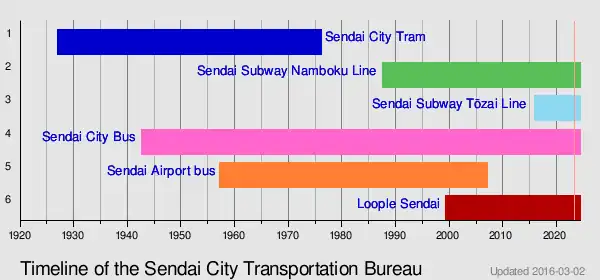 Sendai City Transportation Bureau (仙台市交通局, Sendai-shi Kōtsūkyoku) is a public transport organization in Sendai, Japan. The organization operates subways and buses within the city. It was founded in 1926.