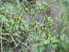 Senecio minimus is an annual or perennial herb up to 200 cm (79 in) tall. Leaves are toothed but not pinnately lobed. One plant can produce as many as 200 yellow or purple flower heads, each with many small disc florets but no ray florets.[7] Its features include taproots with lateral roots that branch out into the soil.[8] Senecio minimus has a tall upper stem, a mid stem and a basal stem.[9] There is a leaf base from the mid stem which supports the leaves of the plant[9] which are sized around 80-250mm long and are spaced evenly.[10] The upper leaves of this species are narrow and linear shaped. They become widest at the auricles at the base of the leaf. The florets of Secenio minimus have triangular corolla lobes which become thicker apically. The stems are erect and are a dark green-purple colour. They have very small hairs below the mid stem, but above the stem it becomes more glabrous.[10]
