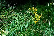 Senecio serra is a species of flowering plant in the aster family known by the common names tall ragwort[1] and sawtooth groundsel. It is native to the western United States, where it can be found in several types of habitat, including sagebrush and woodlands. It is a perennial herb producing a single erect stem or a cluster of stems from a branched, woody caudex. The plant can exceed two meters in height. It is hairless in texture, with young plants sometimes appearing fuzzy, and green to red-tinged in color. The leaves have lance-shaped blades up to 20 centimeters long borne on short petioles, the leaves occurring evenly all along the stems. The inflorescence is a spreading array of many flower heads, each lined with green- or black-tipped phyllaries. The heads contain yellow disc florets and 5 to 8 yellow ray florets each under a centimeter long.