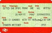 There have been few significant changes since then, with frequent changes in the design of the Railcard being the most noticeable. On all types of ticket for which a discount is available, the level is 34%, as it has been since the changes of 1992; and the types of tickets which receive discounts remains largely the same.[9] The discount is also available on most new ticket types introduced since then, such as SuperAdvance and Virgin Value. Similarly, there has been little change in the types of ticket excluded from receiving discounts; these are summarised here. The restriction on journeys made in the morning peak in the former Network SouthEast area (now known as the "London and South East area") also remains.[10]