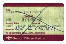 The Senior Railcard is an annual card available to people aged 60 and over, which gives discounts on certain types of railway ticket in Britain. The Railcard has existed in various forms since 1975; the current version is priced at £30.00 and is valid for one year, with a 3-year card available for £70. It is one of a wide variety of discounted and concessionary fare schemes available on Britain's railway network.