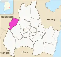 Seo-myeon is a myeon or a township in the subdivision of the Gyeongju City, North Gyeongsang province, South Korea. It is bordered by its neighborhoods including Hyeongok-myeon and Geoncheon-eup on the east, Sannae-myeon on the south and Yeongcheon City on the west and north. Its 52.12 square kilometers are home to about 4,166 people.[1] This population is served by one elementary school and one joint middle school.[2]