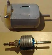 To extend a DC motor's service life, protective devices[22] and motor controllers are used to protect it from mechanical damage, excessive moisture, high dielectric stress and high temperature or thermal overloading.[23] These protective devices sense motor fault conditions[24] and either activate an alarm to notify the operator or automatically de-energize the motor when a faulty condition occurs. For overloaded conditions, motors are protected with thermal overload relays. Bi-metal thermal overload protectors are embedded in the motor's windings and made from two dissimilar metals. They are designed such that the bimetallic strips will bend in opposite directions when a temperature set point is reached to open the control circuit and de-energize the motor. Heaters are external thermal overload protectors connected in series with the motor's windings and mounted in the motor contactor. Solder pot heaters melt in an overload condition, which cause the motor control circuit to de-energize the motor. Bimetallic heaters function the same way as embedded bimetallic protectors. Fuses and circuit breakers are overcurrent or short circuit protectors. Ground fault relays also provide overcurrent protection. They monitor the electric current between the motor's windings and earth system ground. In motor-generators, reverse current relays prevent the battery from discharging and motorizing the generator. Since D.C. motor field loss can cause a hazardous runaway or overspeed condition, loss of field relays[25] are connected in parallel with the motor's field to sense field current. When the field current decreases below a set point, the relay will deenergize the motor's armature. A locked rotor condition prevents a motor from accelerating after its starting sequence has been initiated. Distance relays protect motors from locked-rotor faults. Undervoltage motor protection is typically incorporated into motor controllers or starters. In addition, motors can be protected from overvoltages or surges with isolation transformers, power conditioning equipment, MOVs, arresters and harmonic filters. Environmental conditions, such as dust, explosive vapors, water, and high ambient temperatures, can adversely affect the operation of a DC motor. To protect a motor from these environmental conditions, the National Electrical Manufacturers Association (NEMA) and the International Electrotechnical Commission (IEC) have standardized motor enclosure[26] designs based upon the environmental protection they provide from contaminants. Modern software can also be used in the design stage, such as Motor-CAD, to help increase the thermal efficiency of a motor.