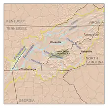 The Sequatchie River is a 116-mile-long (187 km)[2] waterway that drains the Sequatchie Valley, a large valley in the Cumberland Plateau in Tennessee. It empties into the Tennessee River downstream from Chattanooga near the Tennessee-Alabama state line.