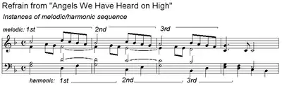A well-known popular example of a threefold descending fifths diatonic sequence is found in the refrain from the Christmas carol "Angels We Have Heard on High,"[4] as illustrated immediately below ("Glo...ria in excelsis Deo"). The one-measure melodic motive is shifted downward at the interval of a second, and the harmonic aspect does so likewise by following the circle of fifths